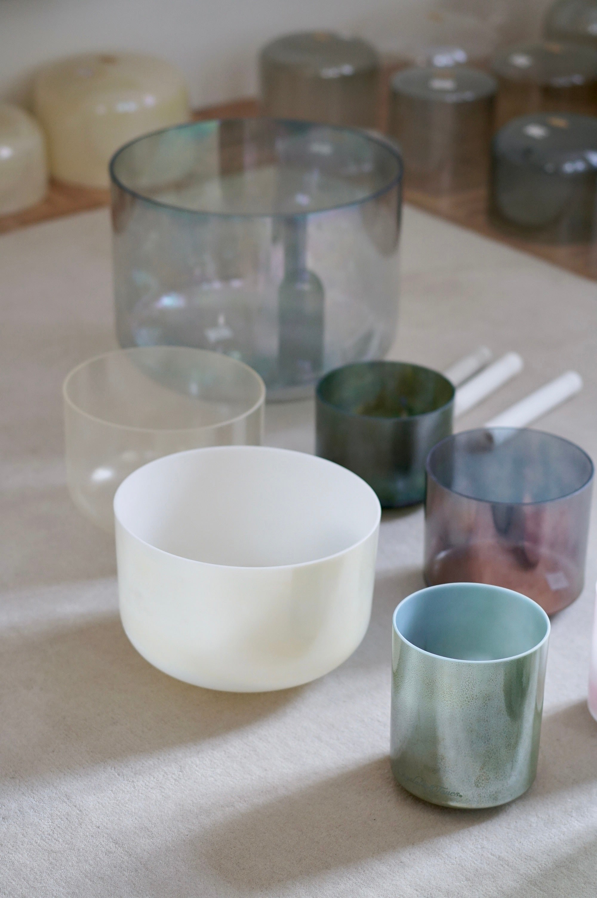 The showroom becomes a living sound laboratory, giving us the chance to listen, compare, feel and explore in a way that is only possible when such a large collection of Alchemy Crystal Singing Bowls is present in one space.